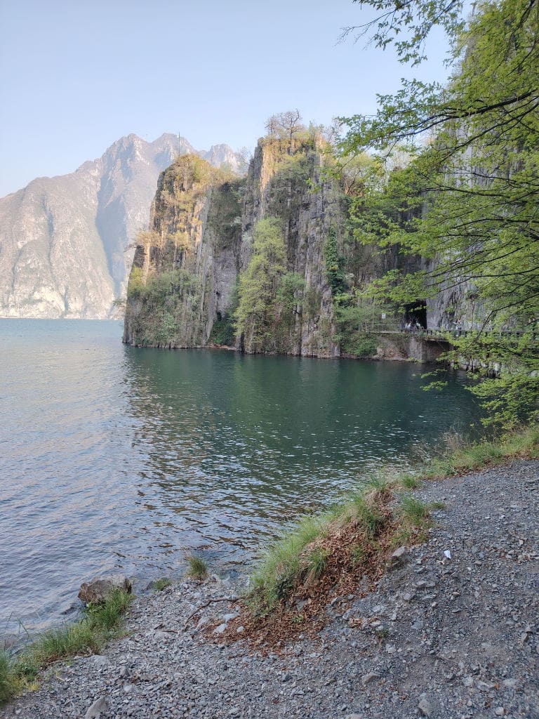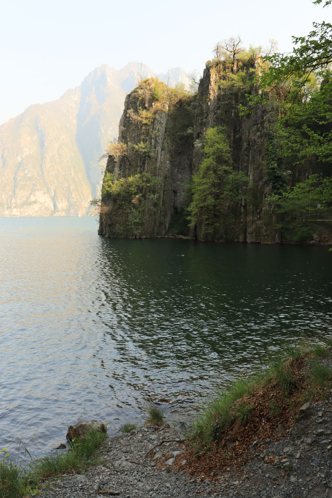 Attraversiamo una piccola galleria e sbuchiamo in questo angolo nascosto bellissimo. Si rimane estasiati guardando le altissime scogliere  ricoperte di vegetazione, i faraglioni e le guglie rocciose, che si lanciano a picco nel lago.