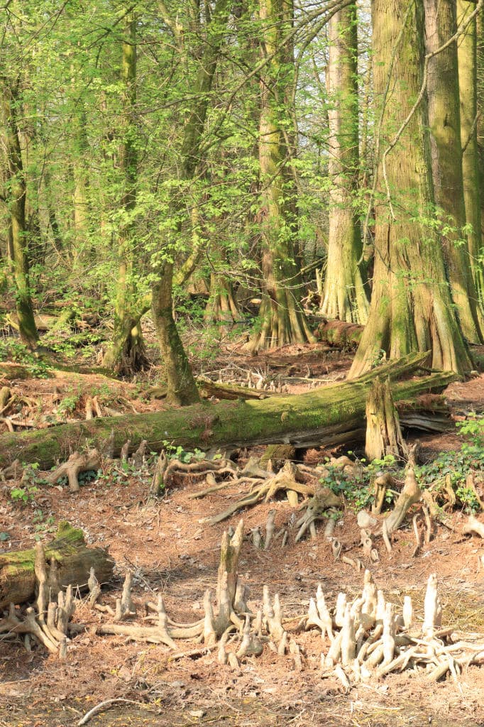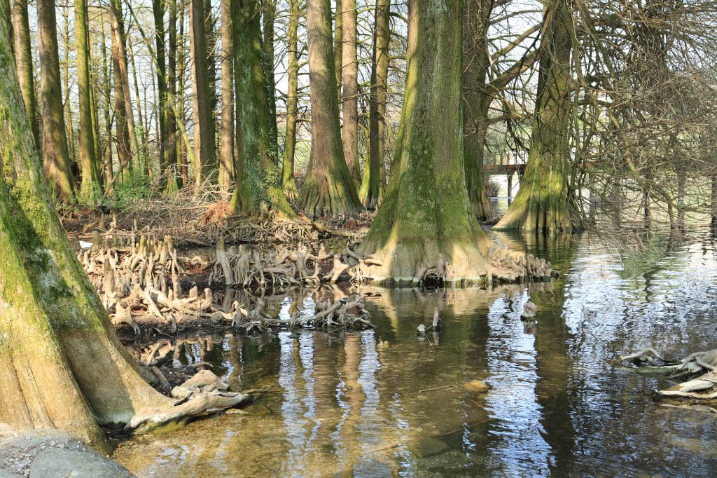 Gli alberi Taxodi sono delle conifere originarie degli Stati Uniti, che possono raggiungere altezze vertiginose. Inoltre molto particolari sono le loro radici aeree che spuntano dall’acqua. Si chiamano pneumatofori e sono una sorta di “boccaglio” che si sviluppa verso l’alto per farle respirare. Oltre a questo servono anche per stabilizzare e ancorare meglio l’albero al suolo.
